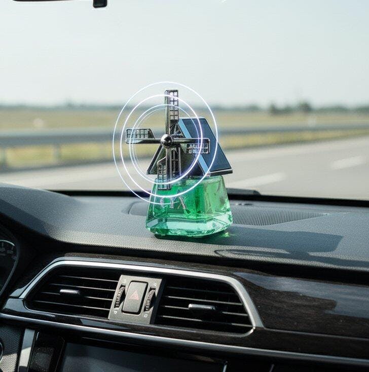 Elevate your driving experience with our mini windmill-shaped solar car fragrance. The automatic rotation of the fragrance in sunlight helps keep you alert and relieve driving stress. Our solar energy collector features 2 PETG solar panels for efficient charging. Enjoy this air freshener anywhere outdoors without the need for batteries or cables, making it perfect for home or car decoration.